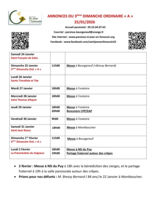 Voici la feuille d'annonces du dimanche 25 janvier 2026