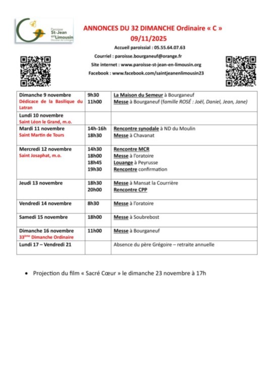 ATTENTION, Samedi 9 novembre, messe à 18h à PONTARION et pas à JANAILLAT car l'église de JANAILLAT est en travaux
